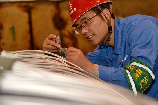 太鋼集團(tuán)質(zhì)檢人員在檢驗(yàn)“筆尖鋼”鋼絲的質(zhì)量情況